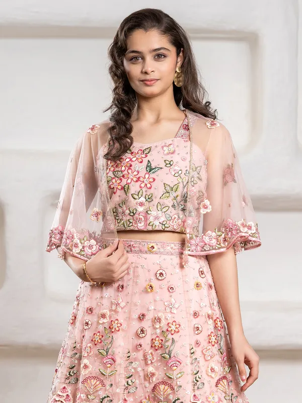 An enchanting pink net lehenga choli. Crafted with embroidery, resham, sequins and sparkling diamond work. The designer cut lends an ethereal appeal, making it a striking choice for weddings and receptions. Elegant layers paired with shimmer detailing create a fairy tale look.